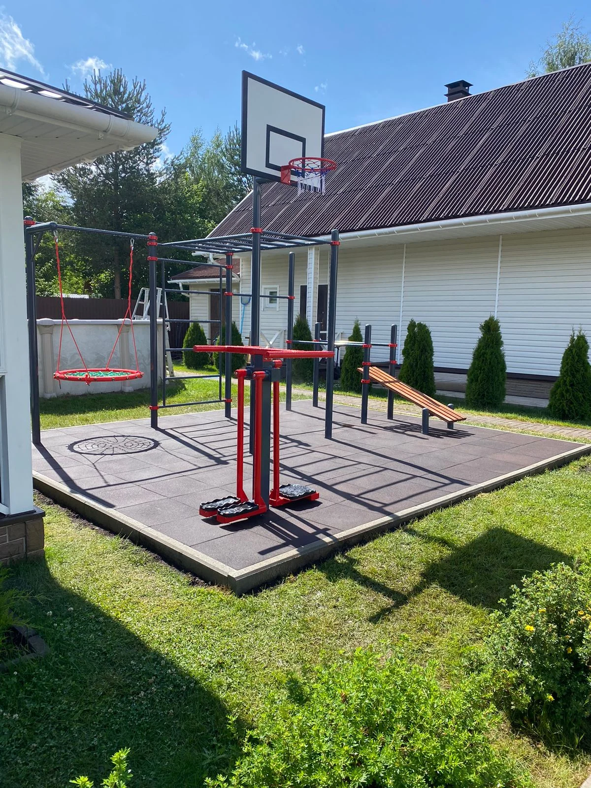 Рукоход, шведская стенка, турник ,брусья, скамья для пресса и баскетбольный щит. Добавление качелей в спортивный комплекс - это отличный способ сделать его более привлекательным и функциональным.